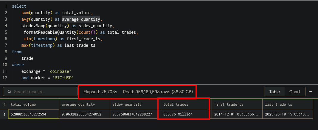 Example: Computing the sum, the average and the standard deviation of the quantity or ALL the orders done on BTC-USD on Coinbase from 2014.